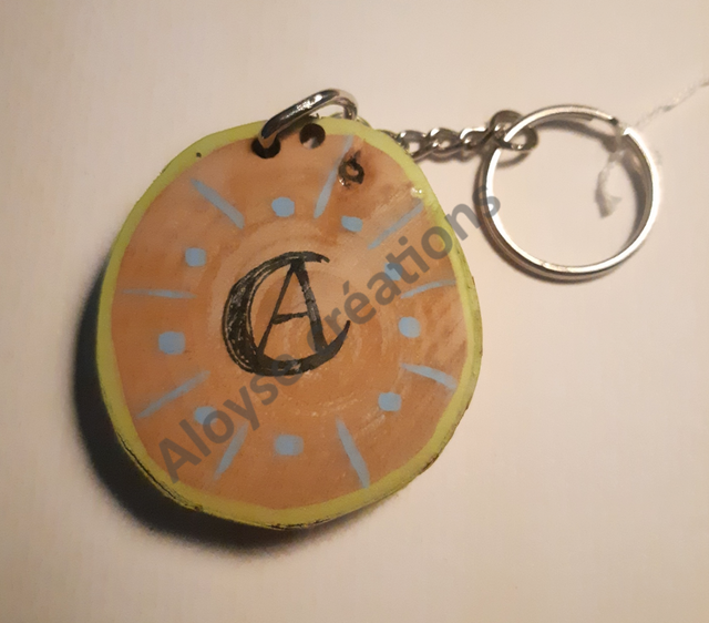 porte clé à rondelle de bois peinte à la main, pièce unique. 6cm de diam. environ